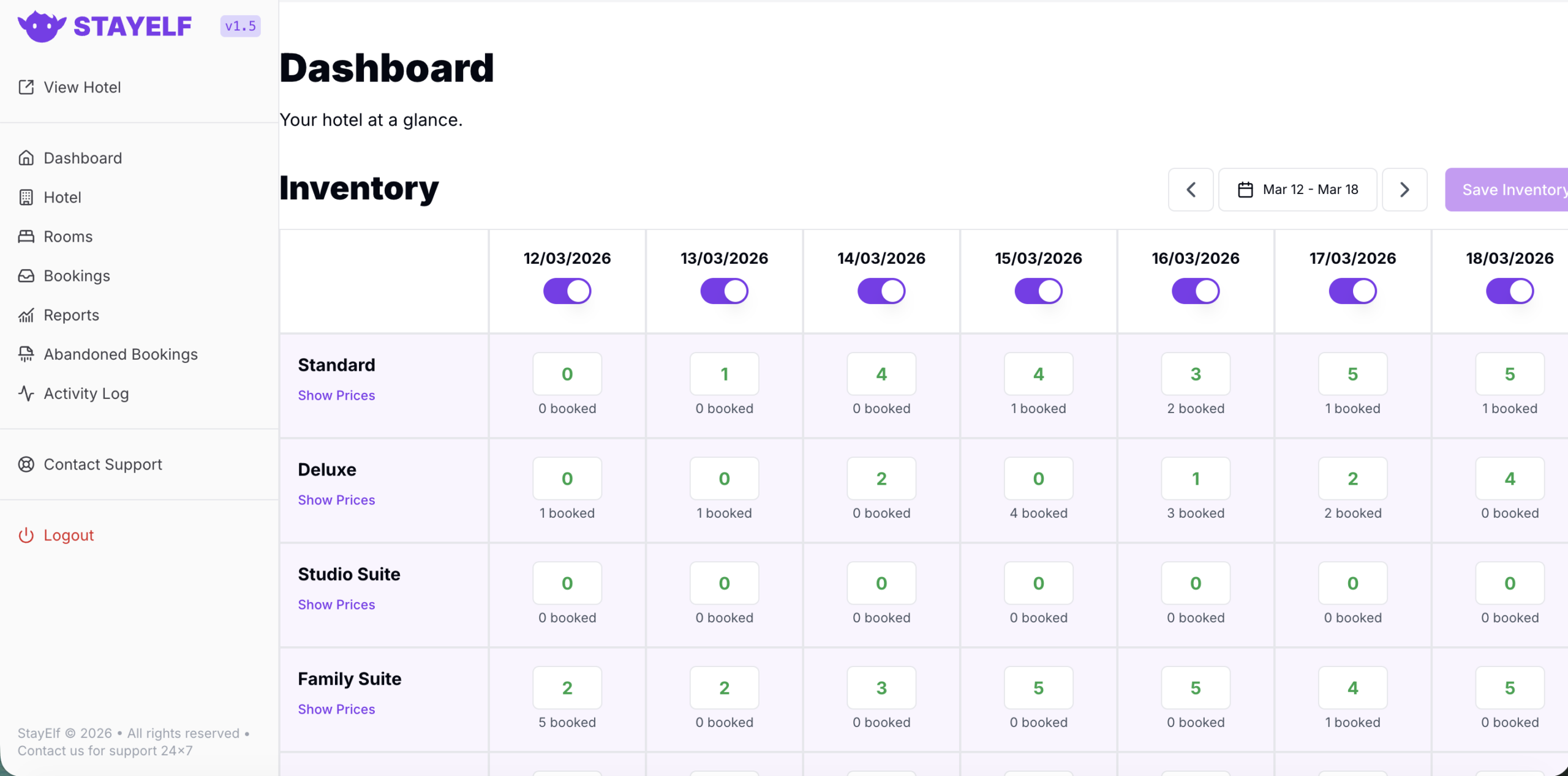 Stayelf gives your hotel a branded, white-label booking engine that lives on your own website. Accept direct reservations, keep 100% of the revenue, and pay just a flat ₹2,500/month.